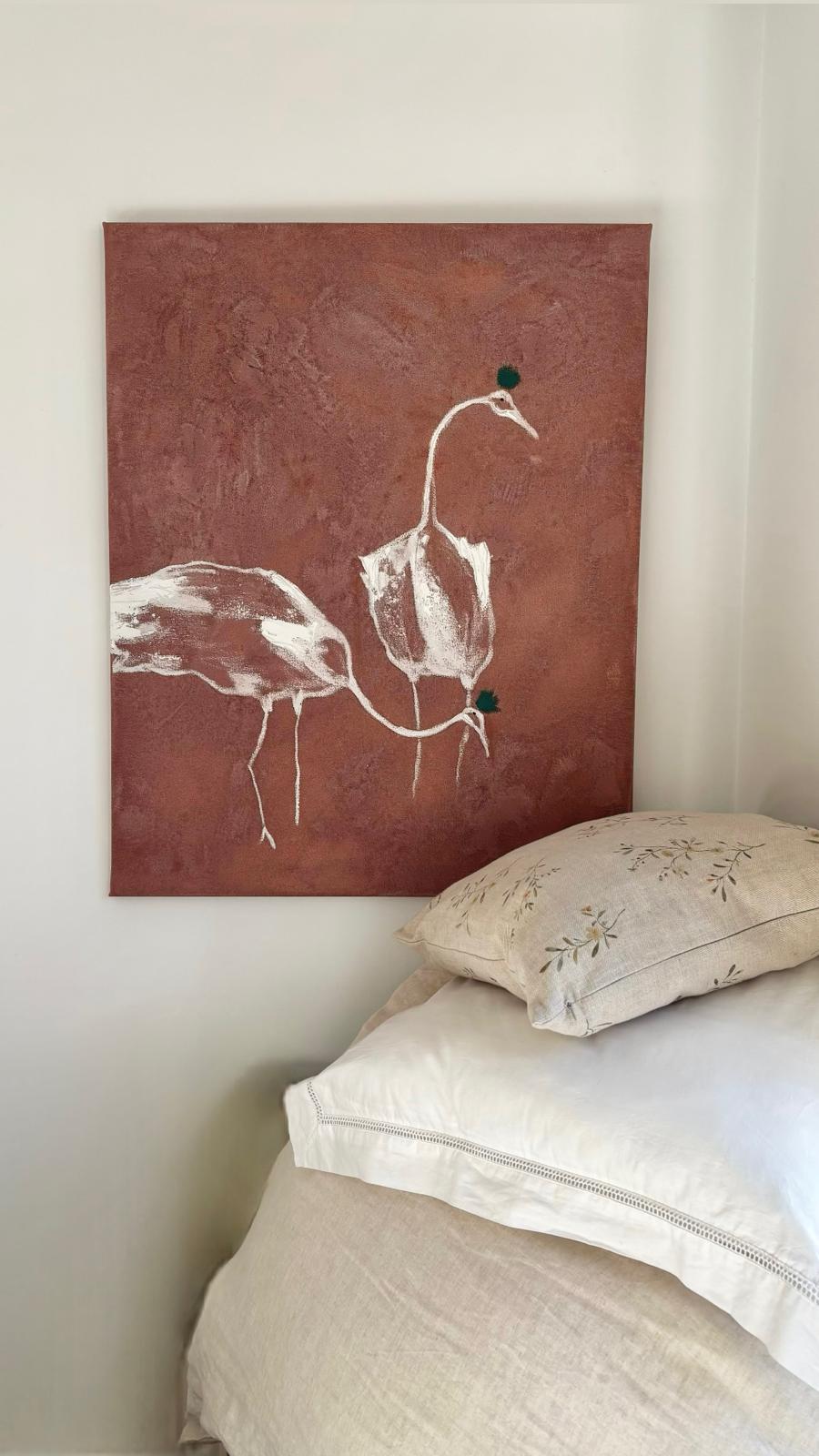 En estos cuadros trabajo sobre el lienzo con técnica mixta – pintura y ceras – jugando con capas, texturas y transparencias. Me gusta que cada pieza tenga algo de movimiento, como si respirara.