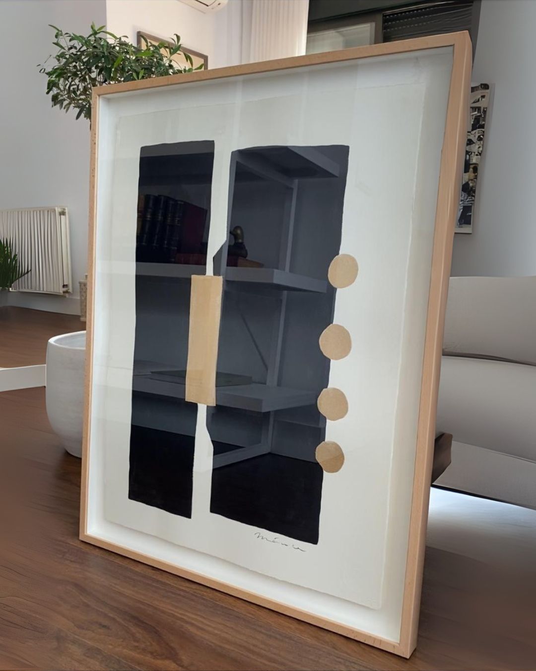 Puede ir enmarcado en vitrina y madera de haya oscura o natural. ( otros tipos de moldura a consultar).
